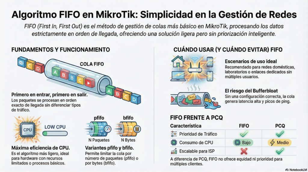 El algoritmo FIFO en MikroTik es la forma más simple de gestionar colas en RouterOS. Es rápido, ligero y fácil de implementar, pero también limitado.