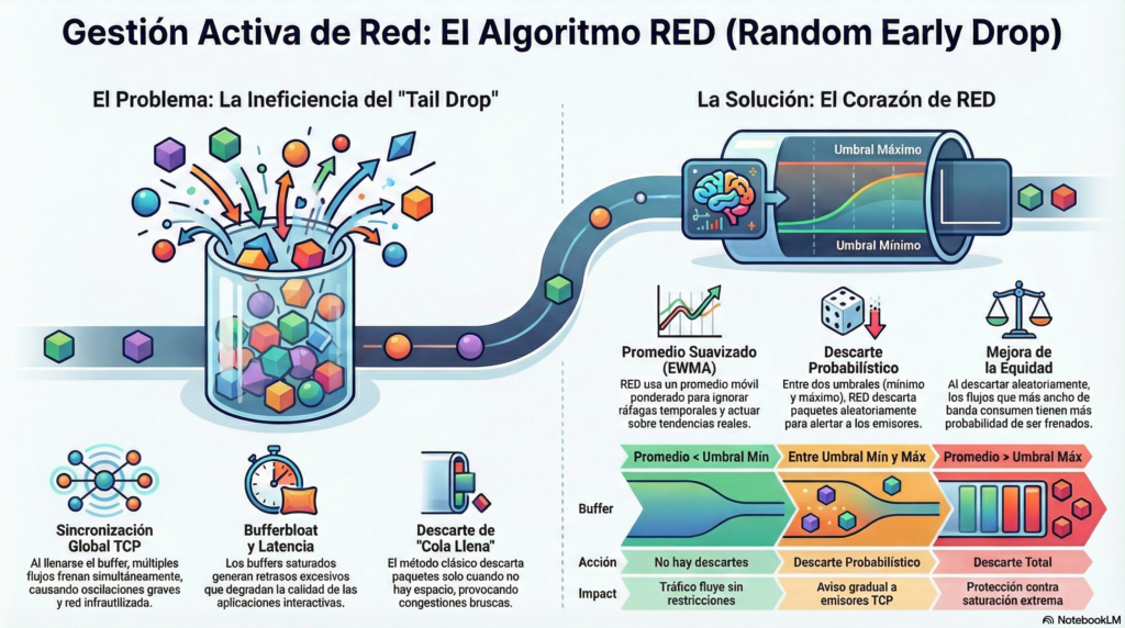 RED (Random Early Detection o Random Early Drop) fue uno de los primeros algoritmos de Active Queue Management (AQM) diseñados para evitar la congestión antes de que ocurra. A diferencia del clásico Tail Drop, RED no espera a que el buffer esté lleno para empezar a descartar paquetes. Actúa antes.