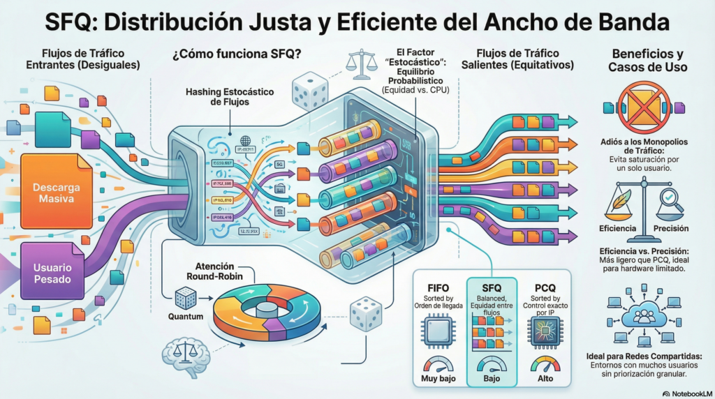 SFQ es un algoritmo eficiente, ligero y práctico para repartir ancho de banda de manera justa entre múltiples flujos de red.