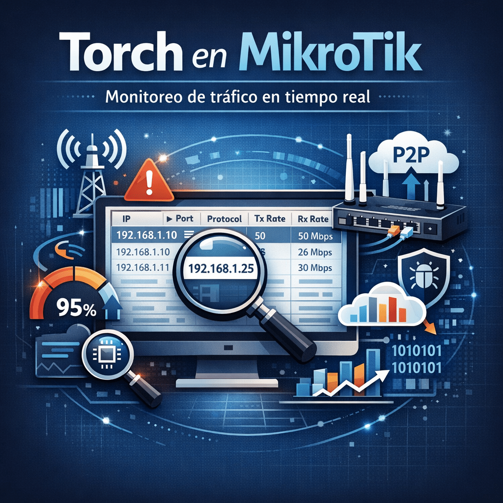 Si trabajas con MikroTik en entornos productivos, tarde o temprano te vas a enfrentar a la misma pregunta: “¿Quién está consumiendo todo el ancho de banda?” Ahí es donde Torch en MikroTik se convierte en una de las herramientas más potentes de RouterOS para el monitoreo de tráfico en tiempo real. No es un simple