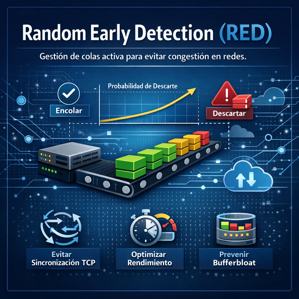 RED (Random Early Detection o Random Early Drop) fue uno de los primeros algoritmos de Active Queue Management (AQM) diseñados para evitar la congestión antes de que ocurra. A diferencia del clásico Tail Drop, RED no espera a que el buffer esté lleno para empezar a descartar paquetes. Actúa antes. Al final del artículo encontrarás