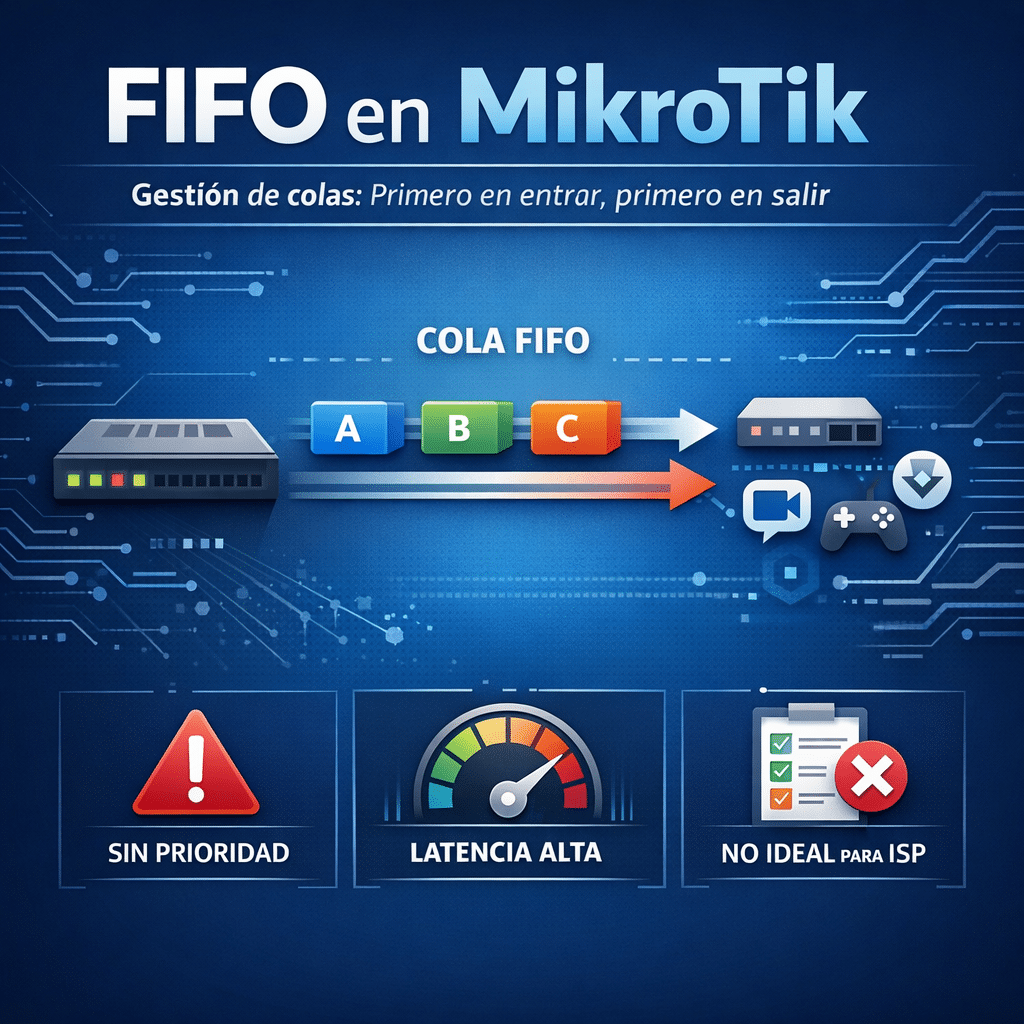 Cuando trabajas con routers de MikroTik, entender cómo funcionan las colas es fundamental para gestionar bien el ancho de banda. Uno de los métodos más básicos —pero aún muy utilizado— es el algoritmo FIFO (First In, First Out). En esta guía te explico específicamente cómo funciona FIFO en RouterOS, cómo configurarlo y en qué escenarios