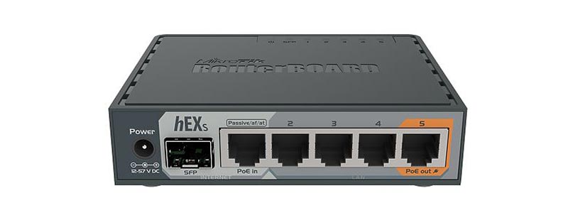 hEX S es un enrutador Gigabit Ethernet de cinco puertos para ubicaciones donde no se requiere conectividad inalámbrica. Comparado con el hEX, el hEX S también cuenta con un puerto SFP y salida PoE en el último puerto.